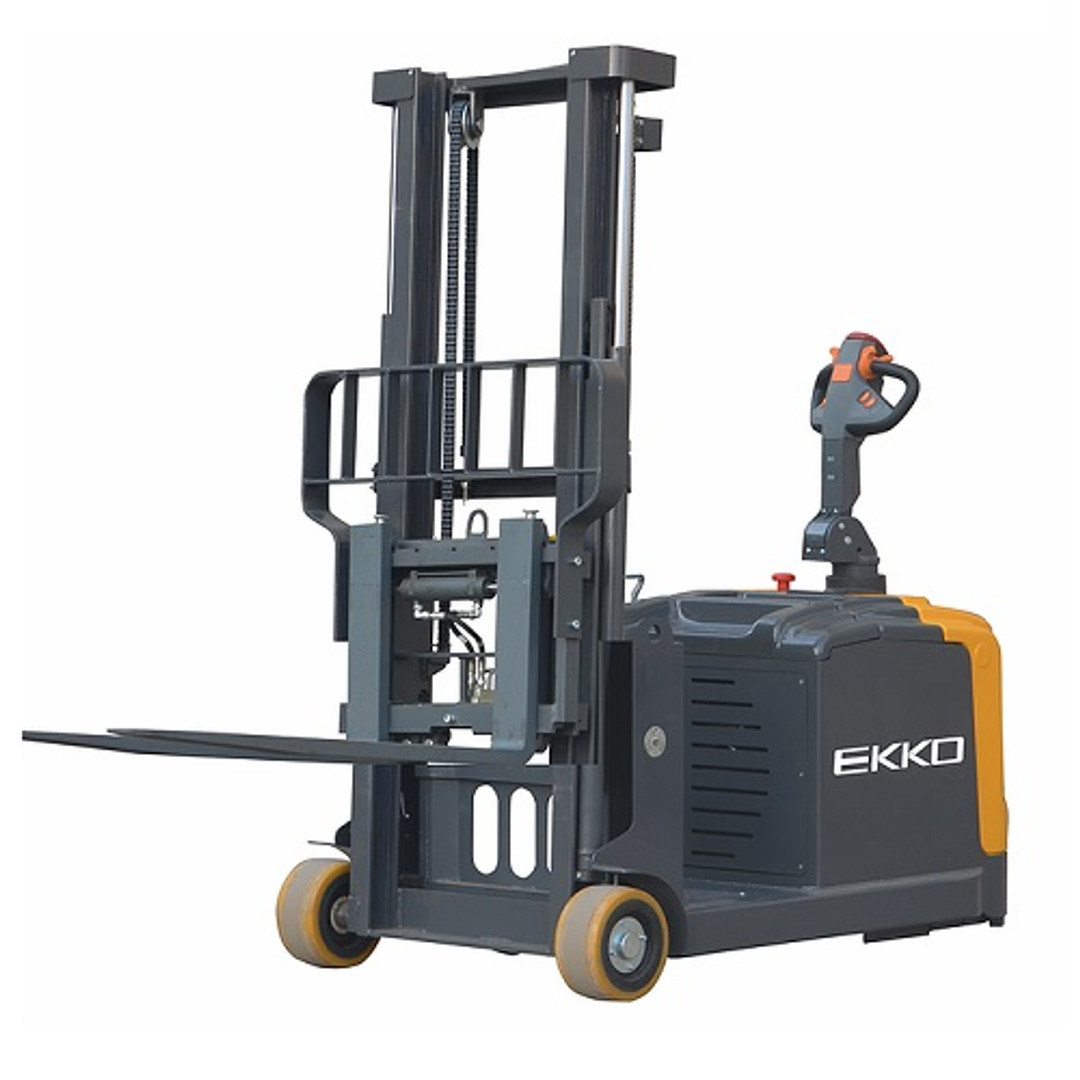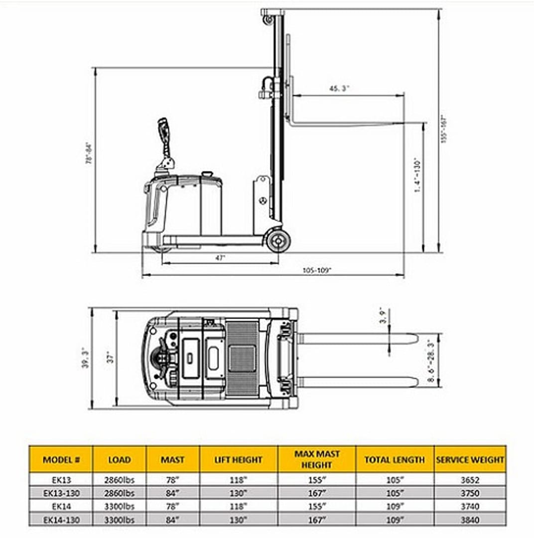 EKKO EK14-130 Counterbalance Walkie Stacker features electric-powered propulsion and lifting and is rated with 3,300 lbs capacity with an outstanding lift height of 130” high. It is highly adaptable and versatile capable of handling jobs done by both a forklift and a walkie stacker maximizing your working effieincy.