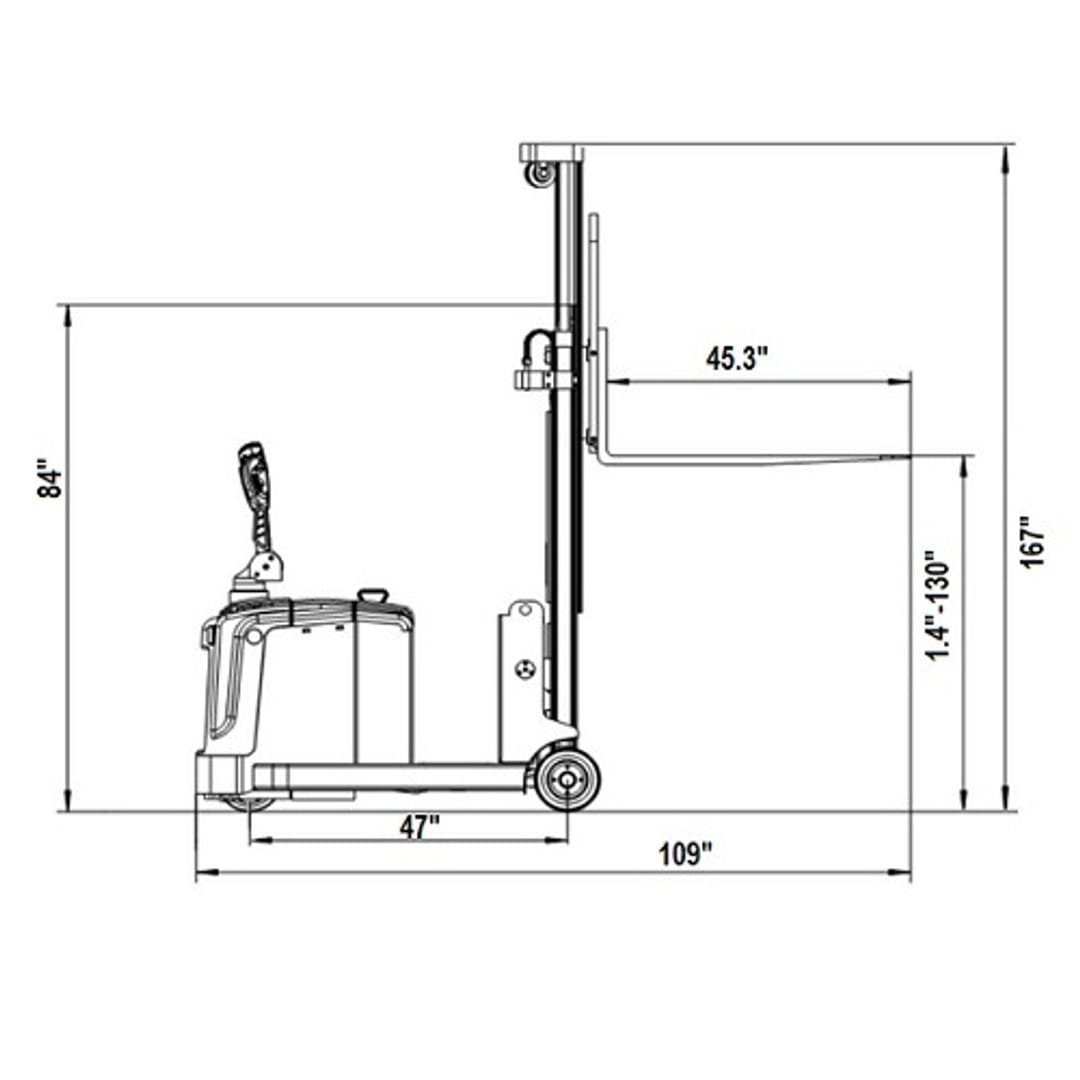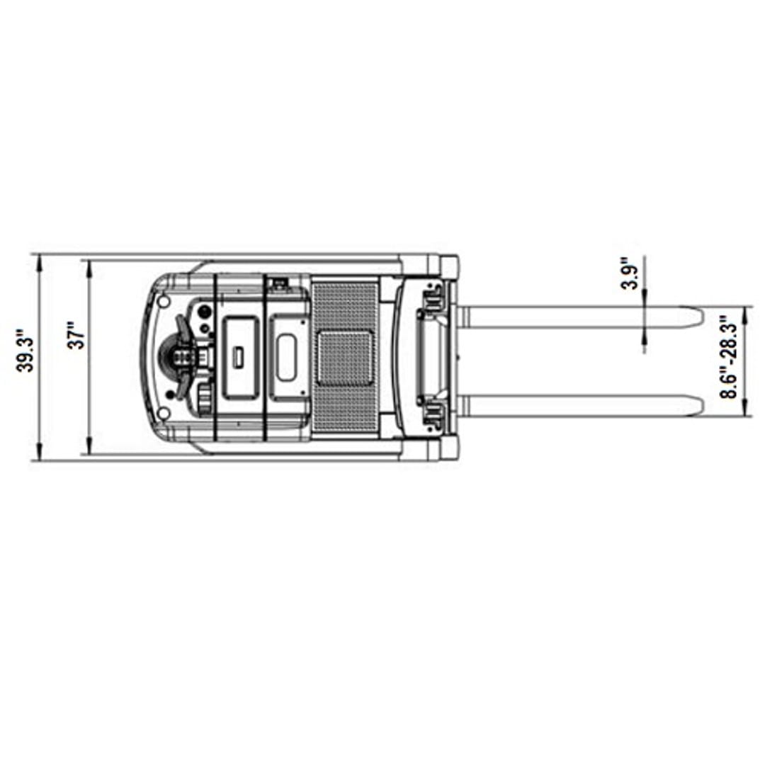 The Counterbalance Electric Lift Truck is equipped with adjustable forks that can go as wide as 28.3” and measures 45.3” long allowing you to deal with a variety of pallets, skids and loads you might have. The unit is conveniently operated using EKKO’s ergonomically designed Curtis Instrument which offers safe and efficient controlling of the Stacker.