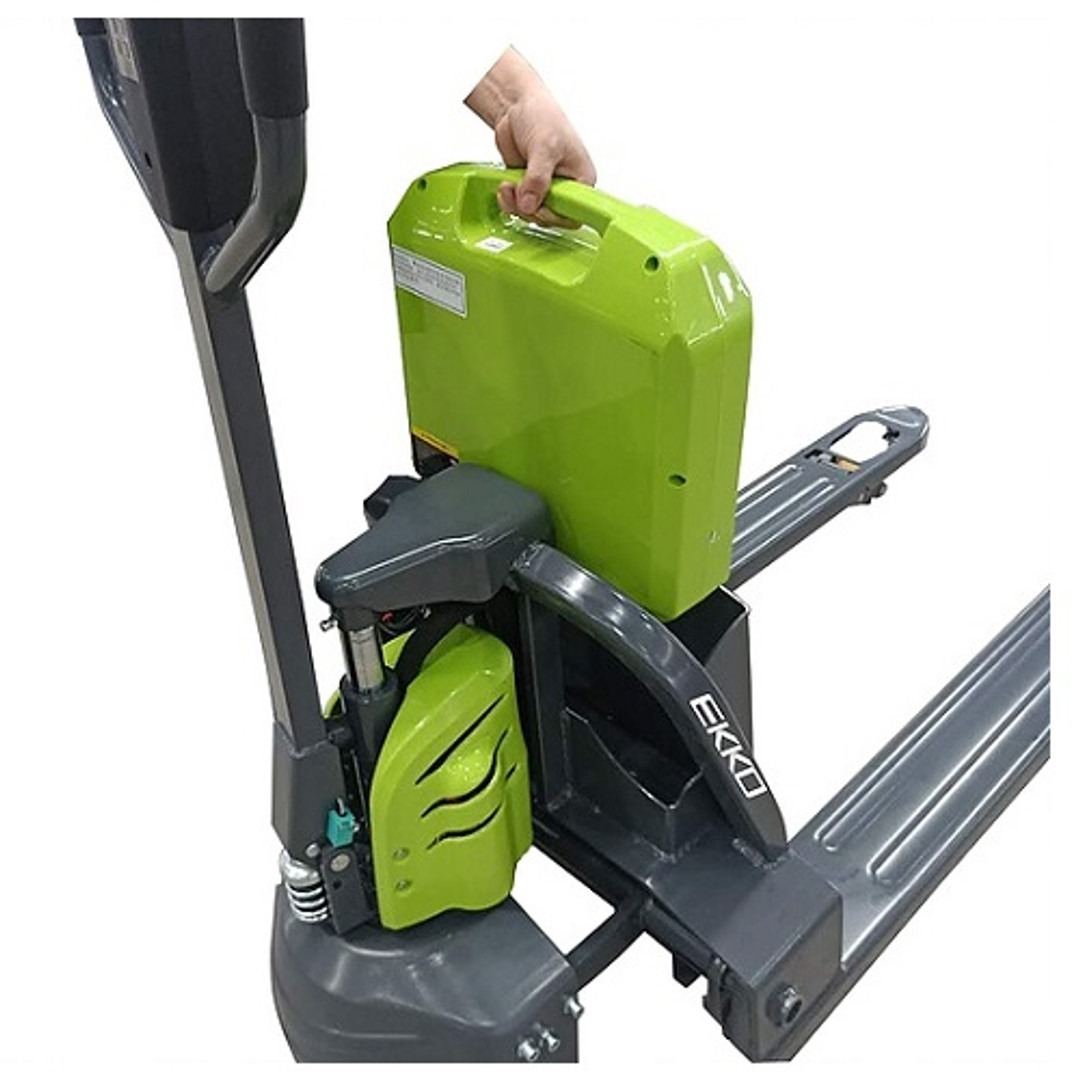 EKKO EP18SLi Lithium Iron Phosphate Electric 4000 Capacity Walkie Pallet Jack features electric-powered drive and lift (lowering is done manually by leaning back the handle). It comes standard with a powerful 24V/30Ah Lithium-ion batteries which offer a stable and low-maintenance power source with a longer service life compared to standard batteries in the market today.