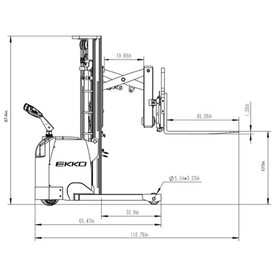 EKKO ER15 Walkie with Side Shifting Reach Truck 3300 lbs. Capacity features both full power drive and lift which is able to lift your loads as high as 177” high with ease at speeds reaching up to 5 inches per second. It also has a power reach of up to 19.7″ for added versatility and flexibility.
